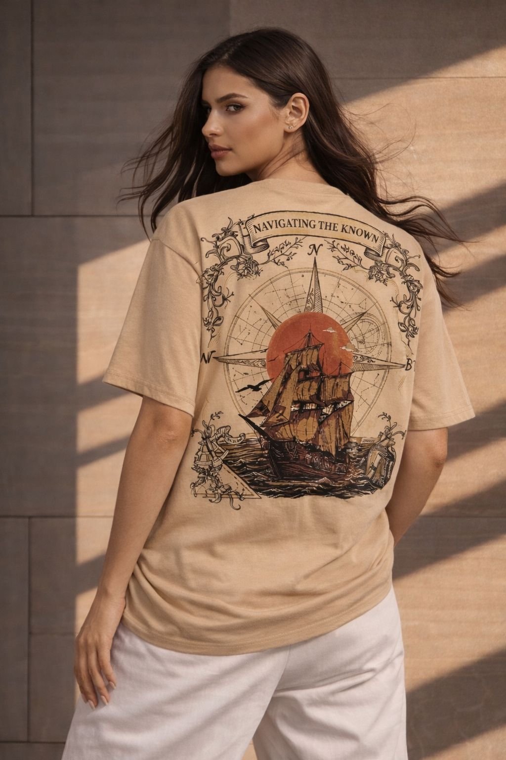 A detailed composition of a sailing vessel, compass structure, and navigational elements represents movement through uncertainty — guided by awareness, not chance.